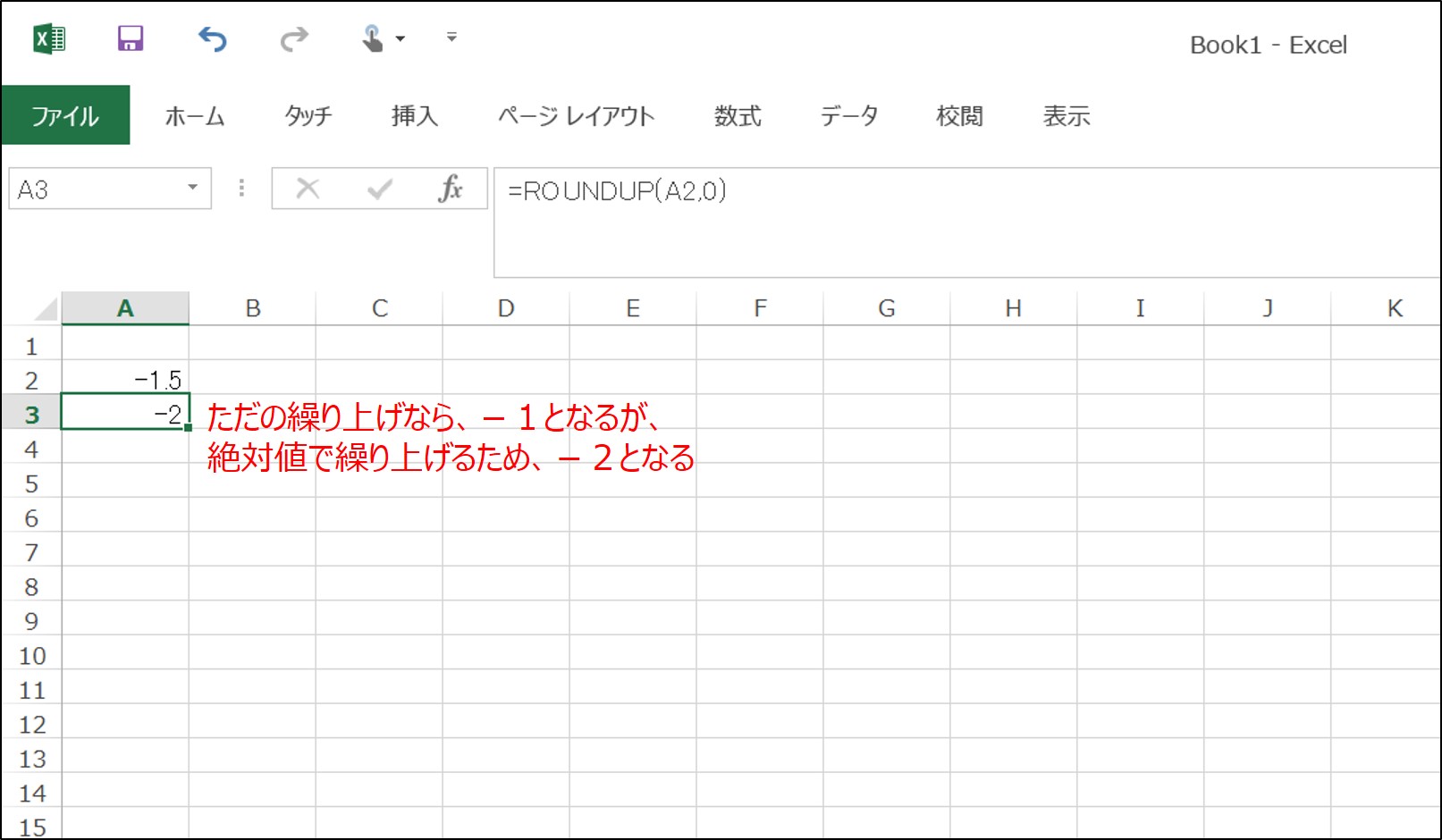 対象の数値が「−1.5」、つまり「=ROUNDUP(−1.5,0)」という式の場合は、返される値は「−2」になります。