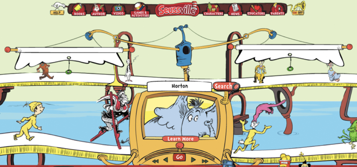Seussvilleから1つ例を見てみましょう。このサイトのデザイナーたちは、 Dr. Seussのキャラクターたちが活き活きして見えるように、かわいらしいキャラクター選択によってそのユニークな世界観を表現しています。Dr. Seuss のあらゆる本の全てのキャラクターは、奇妙なベルトコンベアに乗って次々と流れていき、そこからユーザーがプレイするキャラクターを1つ選ぶことができるようになっています(図5.1を参照)。