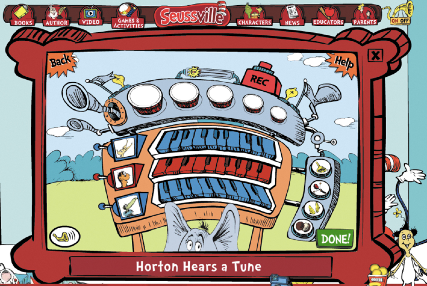 この社交体験は、Seussvilleのサイトのほとんどのゲームで取り入れられています。例えば、ユーザーが「Horton the elephant」のアクティビティリストの中から「Horton Hears a Tune」というゲームを選択した場合、ユーザーは Hortonのサポートのもと、オルガンのような素敵な楽器を使って自分オリジナルのメロディーを作ることができます。その後、実在する人間とのコミュニケーションとして、ユーザーは自分の曲を保存し、家族や友人とシェアすることができます。