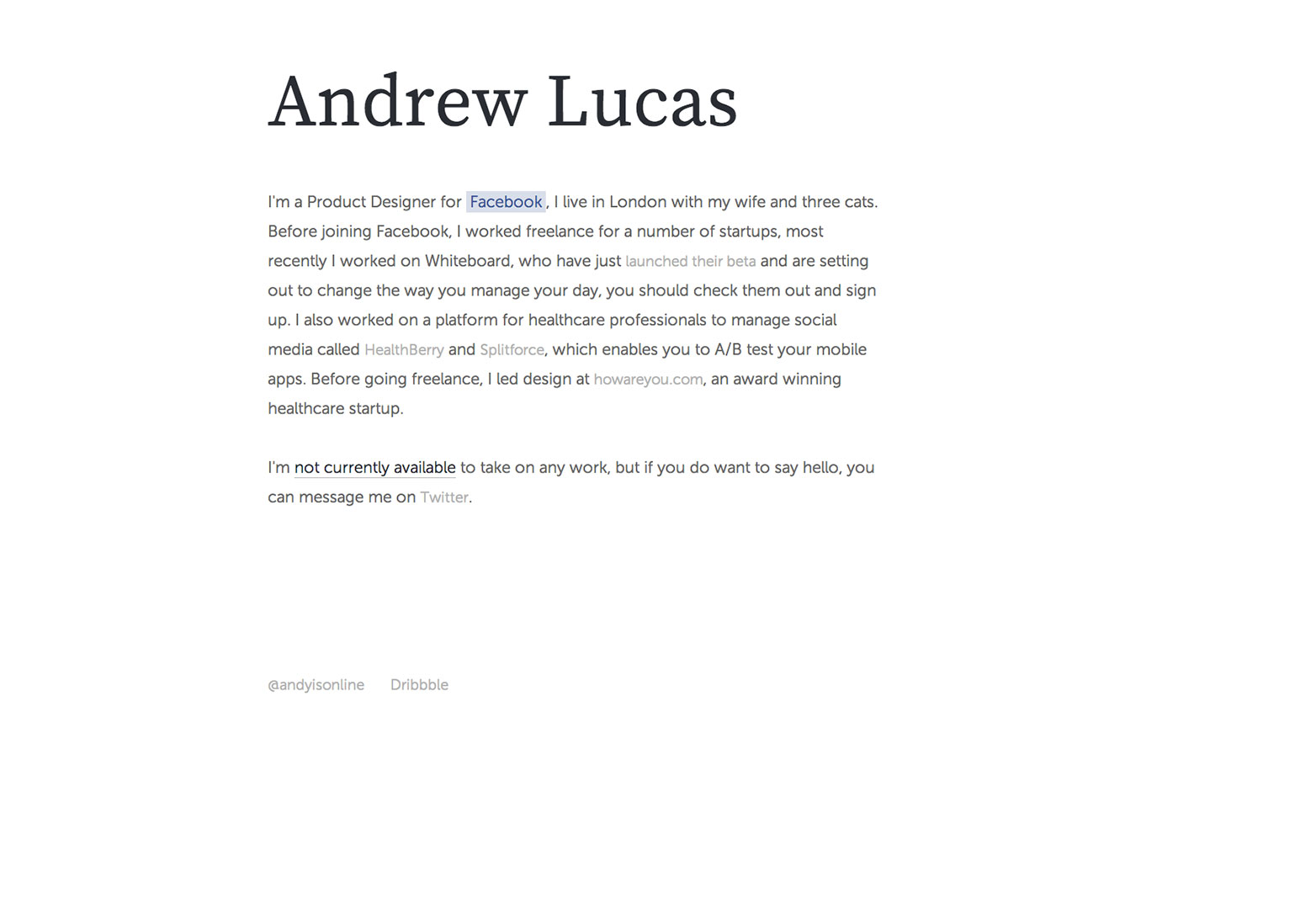 さらにスペースはコンテンツの異なるセクション間にも使用することができ、リーディングエクスペリエンスの改善だけでなく、コンテンツの様々な部分を細分化することで情報の吸収がより簡単になります。Andrew Lucas氏のサイトも、この点を見事に例示しています。彼はロンドン出身のウェブデザイナーで、自身のホームページ上で余白を効果的に使用しています。