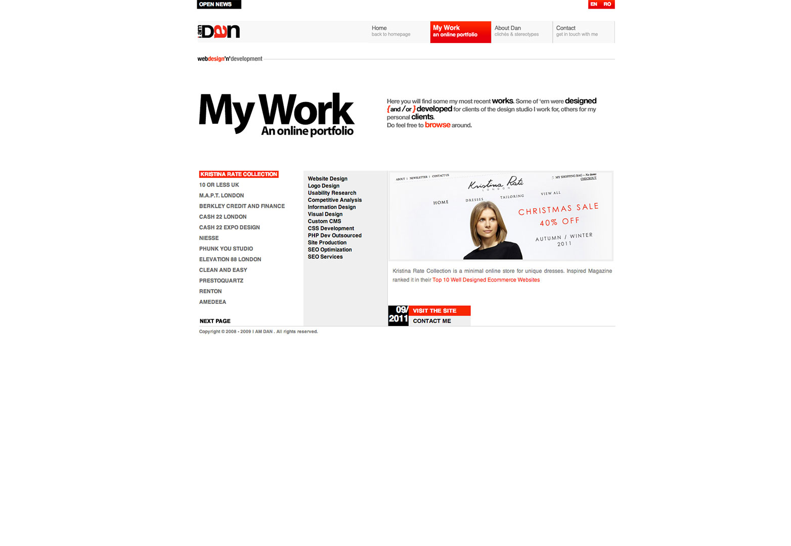 I Am Dan のウェブサイトを支えているウェブデザイナーはこの点をよく理解しており、わずかな色使いで自分のホームページ上にこの概念の典型例を示しています。ウェブサイトの大部分は、ところどころにある赤色で分割された余白となっています。このように、ポートフォリオへのリンクを強調し、サイト訪問者に彼のサイトの閲覧を促す赤色が効果的に際立っていて、訪問者がCTAを完了する機会を結果的に増加させています。