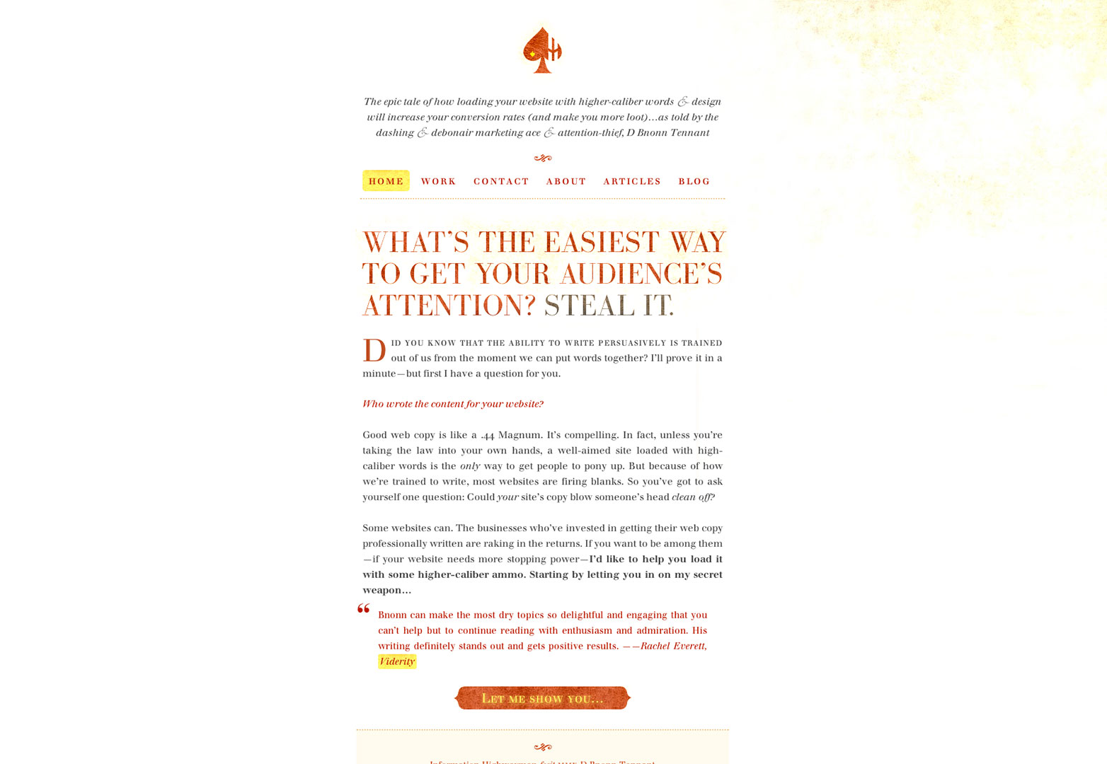 この法則に従って管理されている個人サイトの1つにInformation Highwaymanというものがあり、コピーライター兼マーケターであるD Bnonn Tennant氏が運営しているサイトです。優れたウェブコンテンツがあらゆる小規模の事業に機能することを彼は知っている、と言われているように、Tennant氏が自分のサイトで語ったことの実践を見ると心強く感じます。見出しコピーやテキスト、メニューバーにおける文字の間の空間は、リーダビリティーとレジビリティーを保証する要因となっています。