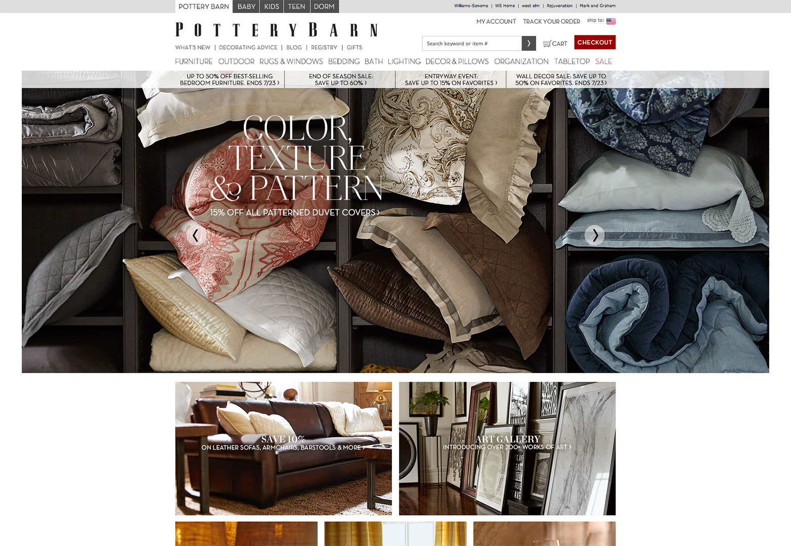 質の高いブランドはこのような現象への理解を誤ることなく、的確な効果を発揮させるためにより多くの余白を定期的に活用してきました。Pottery Barnは高級家具の有名な小売業者で、ウェブサイトにおける余白を賢明に利用し、T字型にしています。余白でホームページを占領し、その多くをページの両側に取り入れることで、サイト訪問者の注意をページ中央にあるお得情報や宣伝に直接向けさせることができるのです。ページ上部にあるブランド名自体も、文字の間に十分な余白を確保して特徴づけています。
