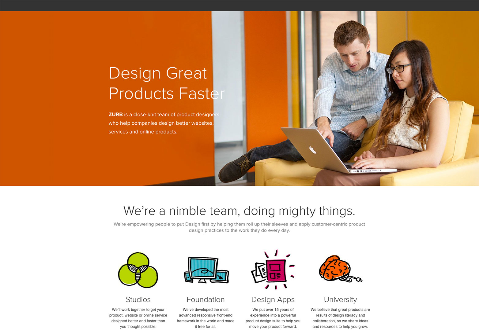 ウェブデザイン会社であるZurbも、余白がいかに色を際立たせているかを例示しています。同社のホームページは上部にある1つの固定カラーと、(スクロールをしなくても見ることが可能なウェブページのすぐそばにある)異なるウェブページに使用された色とりどりのアイコンによって特徴づけられています。最小限の色使いに加え、ホームページ全体のデザインが余白を特色としているのです。