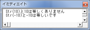 '10で比較 If Str(10) = "10" Then Debug.Print "Str(10)と10は等しいです" Else Debug.Print "Str(10)と10は等しくありません" End If '-10で比較 If Str(-10) = "-10" Then Debug.Print "Str(-10)と-10は等しいです" Else Debug.Print "Str(-10)と-10は等しくありません" End If