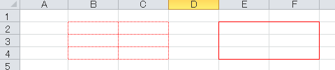 'セルB2~C4に罫線設定(点線,極細,赤)/Borders.XXプロパティ使用 With Range(Cells(2, 2), Cells(4, 3)).Borders .LineStyle = xlDot .Weight = xlHairline .Color = vbRed End With 'セルE2~F4に罫線設定(連続線,太さ設定なし,赤)/BouderAroundメソッド使用 Range(Cells(2, 5), Cells(4, 6)).BorderAround LineStyle:=xlContinuous, Color:=vbRed
