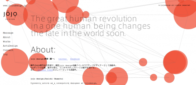 インタラクティブデザイナーとして国内外で活動中のjojo design(岡本順一)さんのポートフォリオサイトです。円と線の組み合わせが特徴的で、スタイリッシュなデザインに仕上がっています。