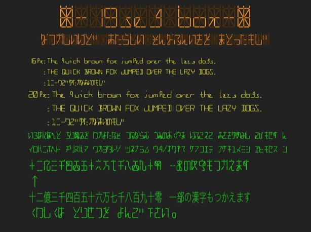 デジタル時計を連想させるようなステンシル系フォント。漢字・ひらがな・カタカナ・数字など種類も豊富です。レトロから未来感まで表現できます。