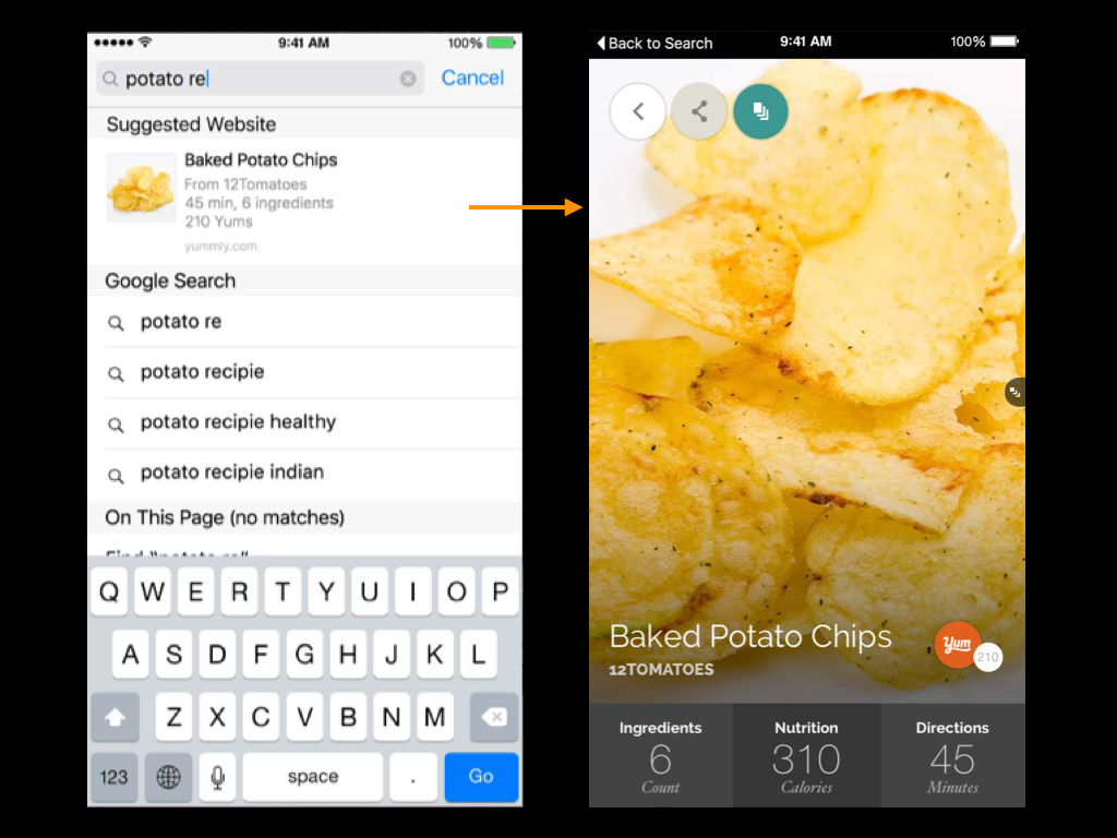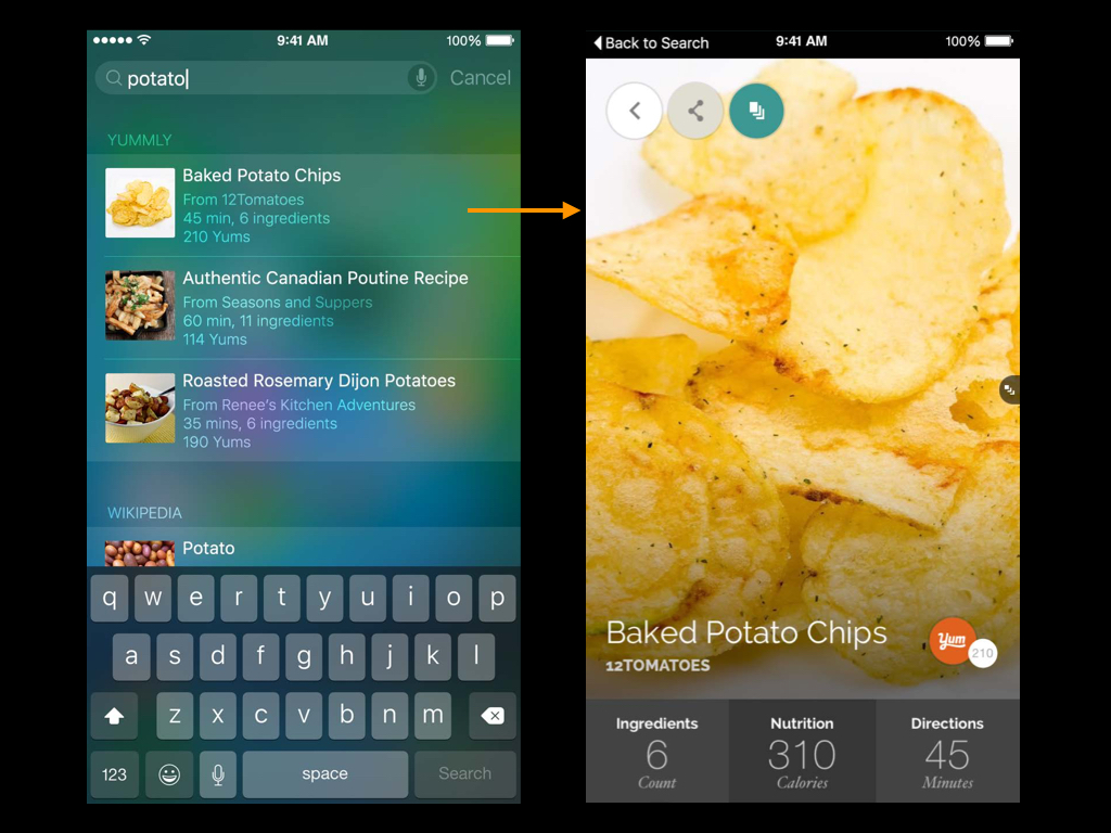 下の画像はWWDC2015でAppleが発表した例です。Spotlightで「potato」と検索するとYummlyというアプリに掲載されているレシピが表示されます。この検索結果をタップするとアプリのレシピ詳細画面に直接アクセスすることができます。