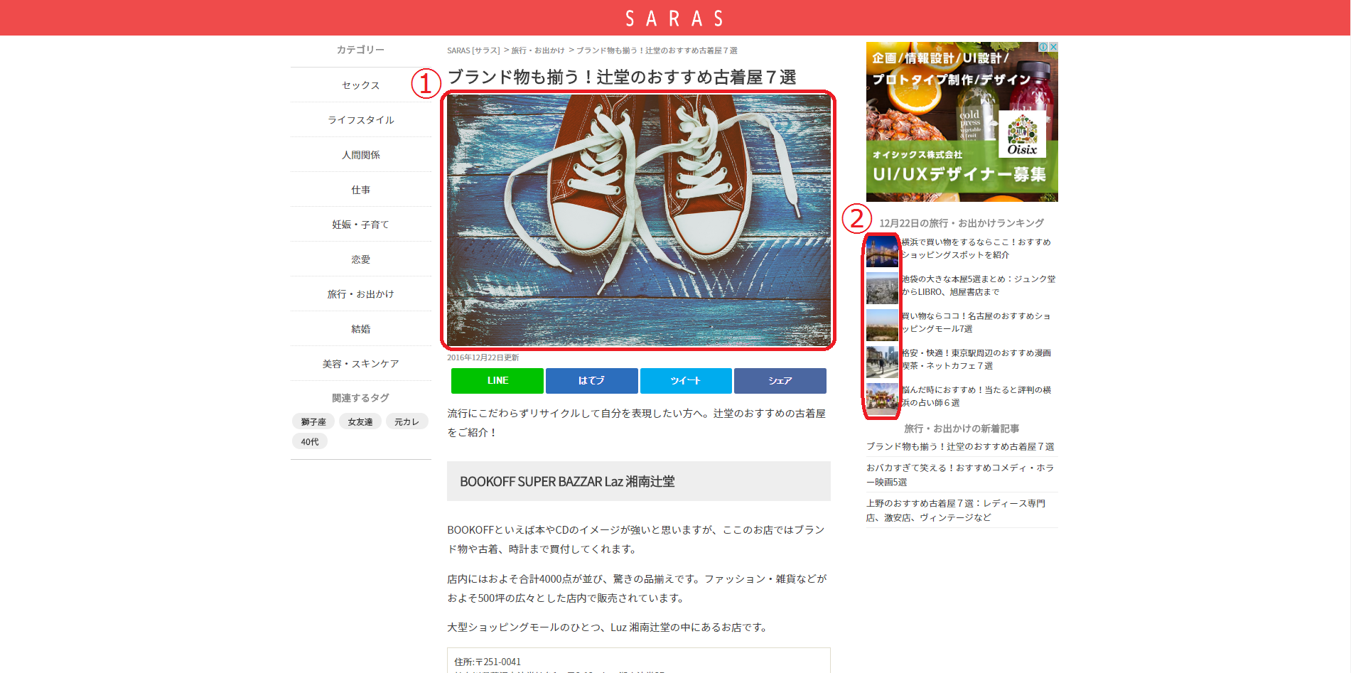 上記のサイトを参考にすると、記事を紹介するために見出しになっている画像①がアイキャッチ、右列のにある他の記事を紹介する圧縮された画像②のそれぞれがサムネイルとなります。