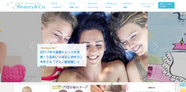 資生堂とインフォバーン社が共同で運営するオウンドメディア「Beauty & Co.」。「アラサー女子のキレイを応援します。」というコンセプトの元、美容情報を発信しています。