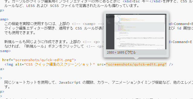 イメージファイルなどがある場合は、カーソルをファイル文字列に持ってくると、自動でポップアップされて確認できるようになっています。