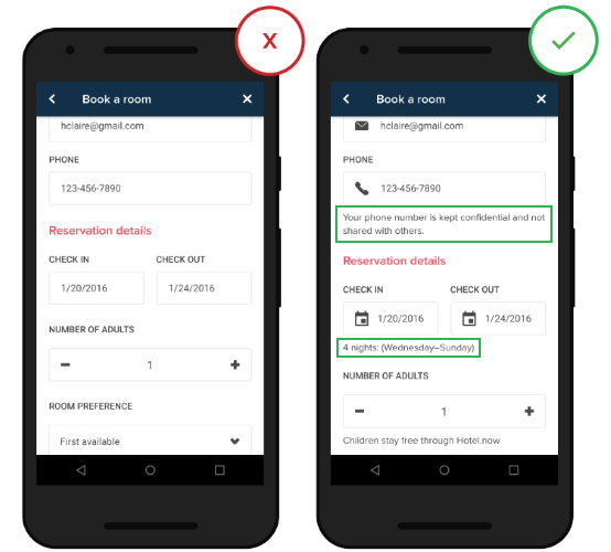 データ入力のプロセスをできる限り簡単にすべきです。 どんな情報がそれぞれのフィールドに入るのかを示すことや、ヘルプテキストのようなマイナーチェンジでさえも、UX全体に伴い入力フィールドのユーザビリティを著しく改善します。