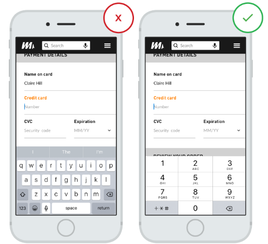 ユーザーは、テキスト入力に適したキーボードを提供するアプリを高く評価します。以下の例では、数値入力が必要なフィールドでテキストキーボードが表示された場合、ユーザーがキーボードの数字キーをタップして数値入力を有効にする必要があることがわかります。