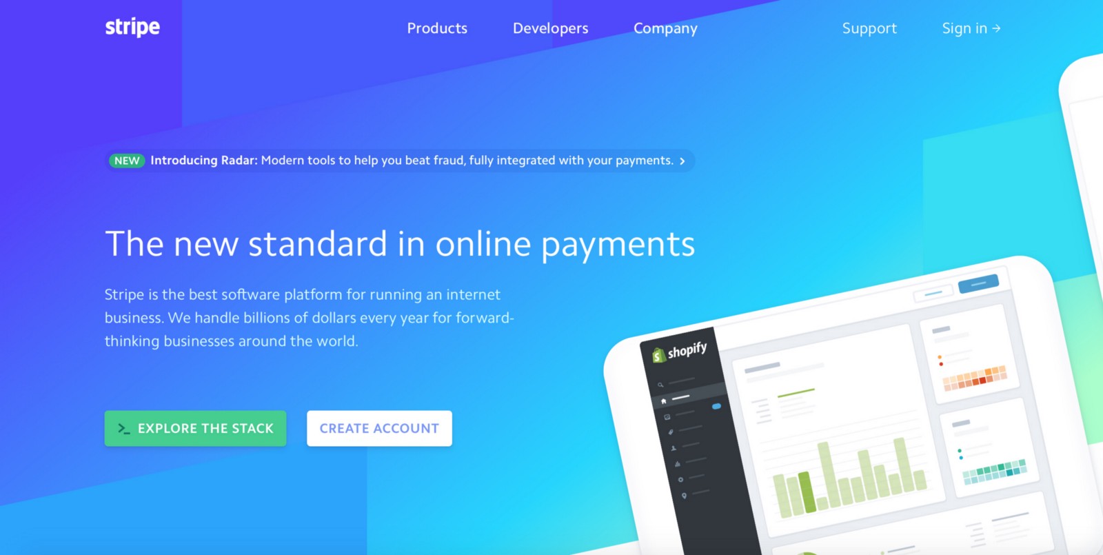 Stripeのホームページでは1つ目と2つ目の両方のCTAボタンが、背景より浮き上がっています。