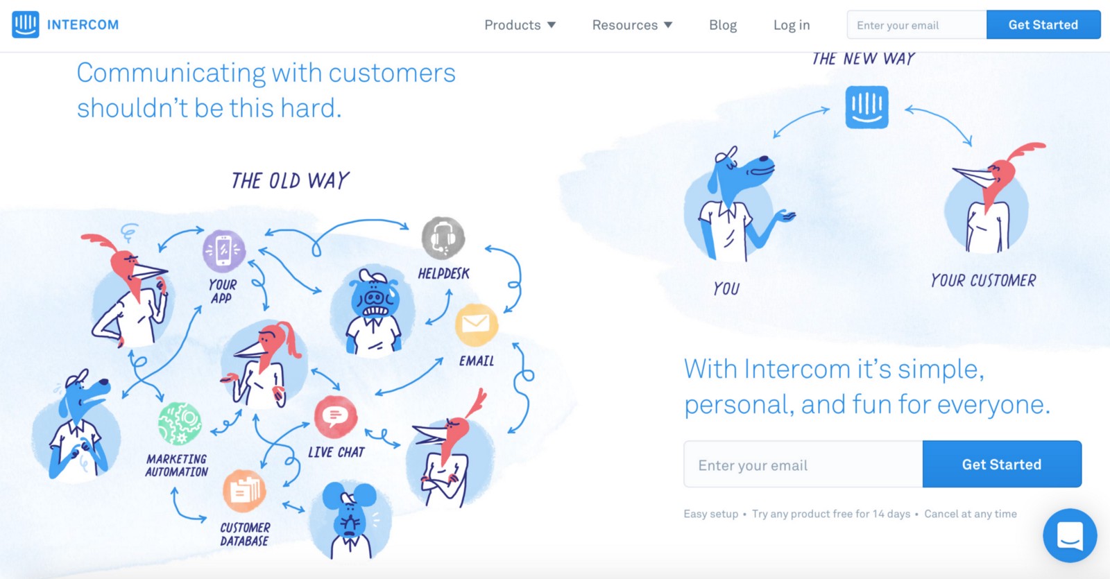 Intercomは、情報を含むイラストを用いています。これにより、重要な情報を欠かすことなく、視線をガイドします。