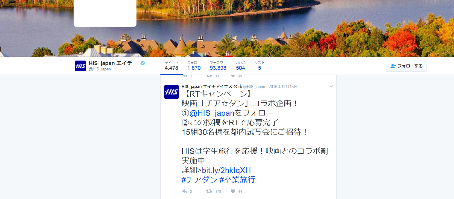Facebookだけではありません。こちらはTwitterという機能そのものを使ったマーケティングです。Twitterでアカウントをフォローし、この投稿をRT(リツイート)すると抽選で映画の試写会をプレゼントするというキャンペーンとなります。旅行以外でのアプローチは新鮮ですが、ブランドロイヤリティが上がります。また、RTすることで情報が拡散し、多数の人に情報を届けることが可能です。