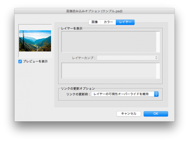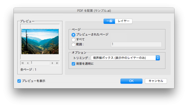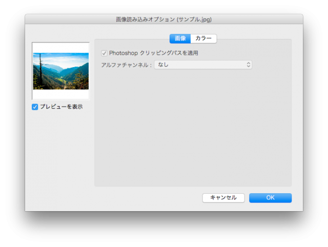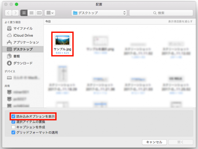 配置したい画像データを選択します。この時、「読み込みオプションを表示」にチェックをいれておくと、配置する際の設定を決めることができます。読み込むデータによってオプションの表示の仕方が違います。