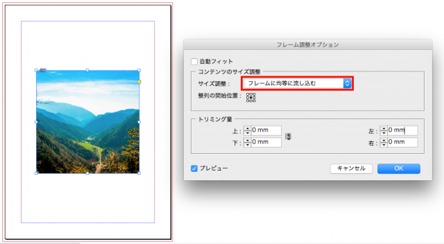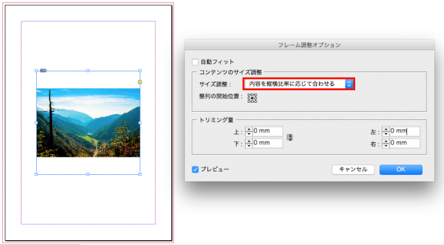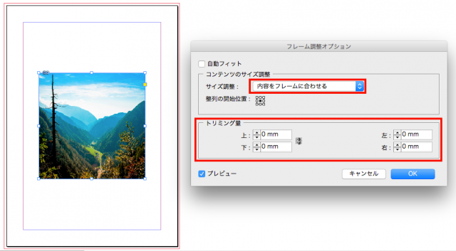 例えば、コンテンツのサイズ調整>内容をフレームに合わせる、トリミング量はすべて0mmにします。プレビューにチェックをいれるとリアルタイムで変更結果が表示されます。この設定にすると、画像はフレームにあっていますが、元々の画像比率が違うので若干画像がつぶれてしまっています。