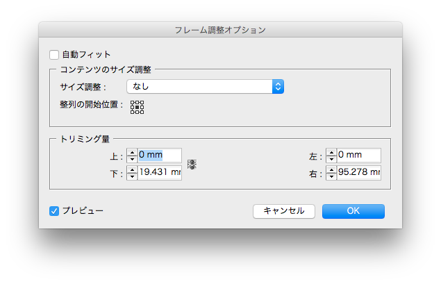 メニューバーから、オブジェクト>オブジェクトサイズの調整>フレーム調整オプションを選択します。