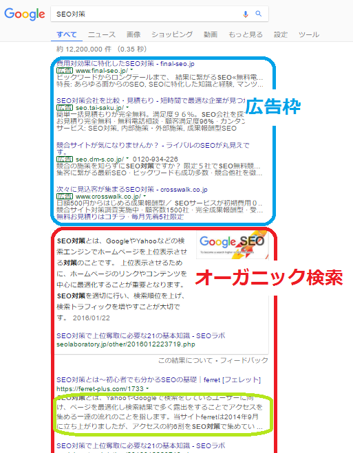 上図のように、検索結果画面の一番最初に出てくるサイトが広告枠で、その下に表示されるサイトがオーガニック検索により得られたサイトとなります。