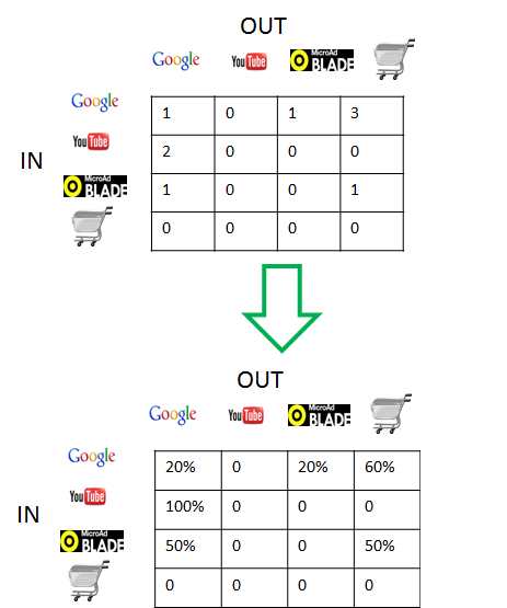 ベイジアンネットワークモデルと同様の、確率論をベースとしたモデルです。CVまでにAの広告を経てCの購入ページへ行くというプロセスがあったとします。その確率がどのくらいか求めることができれば、Aの広告の価値が分かるようになるという仕組みです。計算方法は以下をご覧ください。