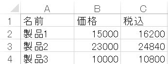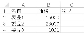 このデータのC列に、税込み価格を書き込むプログラムを書きます。