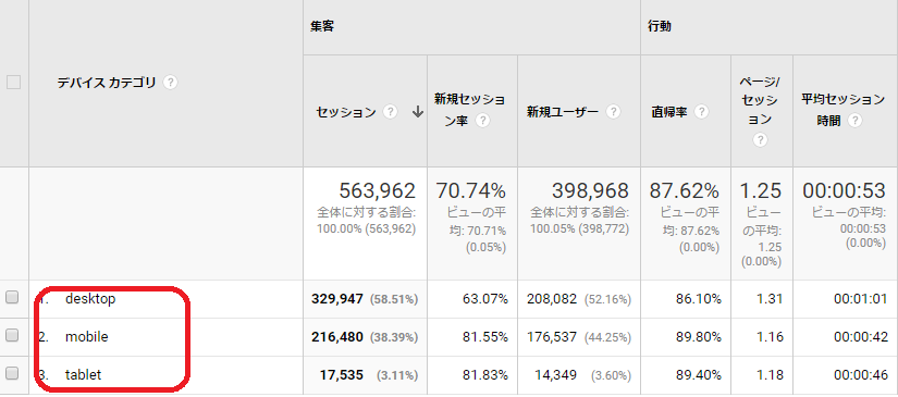それぞれのデバイスからのセッションなども調べることができるため、SEO対策を行うときに役立ちます。