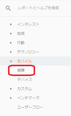Google Analyticsを開くとページの左側にメニューがあるので、上図のようにユーザーのモバイルをクリックして、概要を選択してください。