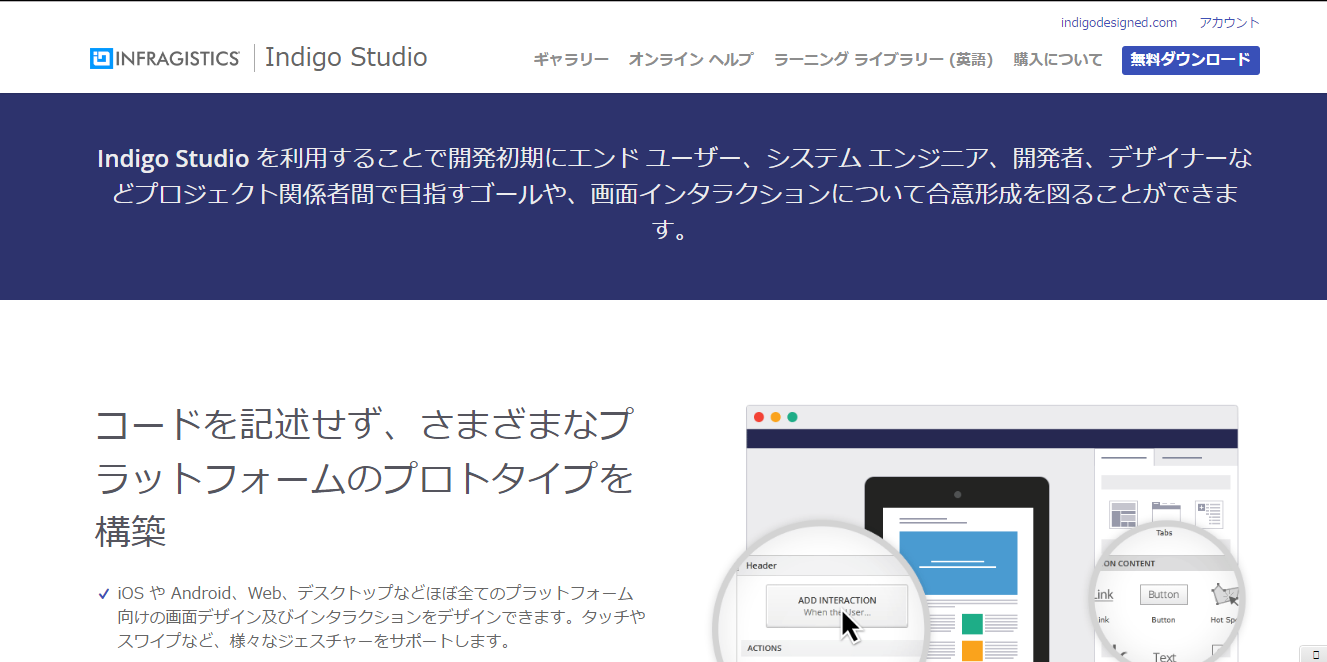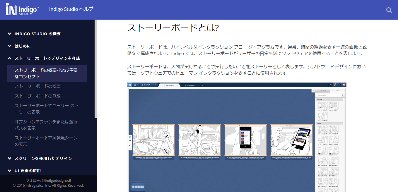 Indigo Studioは、インフラジスティックス・ジャパン株式会社が2016年にリリースしたプロトタイピングツールです。ユニークな機能としては、「ストーリーボード」があります。専用のスペースに、ユーザーの行動を「時間軸」で分割し、各段階の「画像」「説明文」を挿入して作成します。