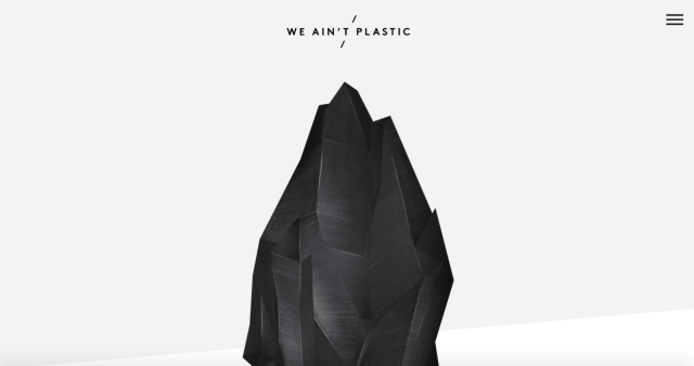 - コントラスト:少ない要素でデザインしなければならないので、ビジュアルの階層がわかりやすくなるよう配慮しなければなりません。下の『We Ain’t Plastic』の画像例では、白い背景に真っ黒な宝石が配置されています。コントラストがわかりやすいデザイン例で、まさにミニマルデザインの本質を表したものと言えるでしょう。