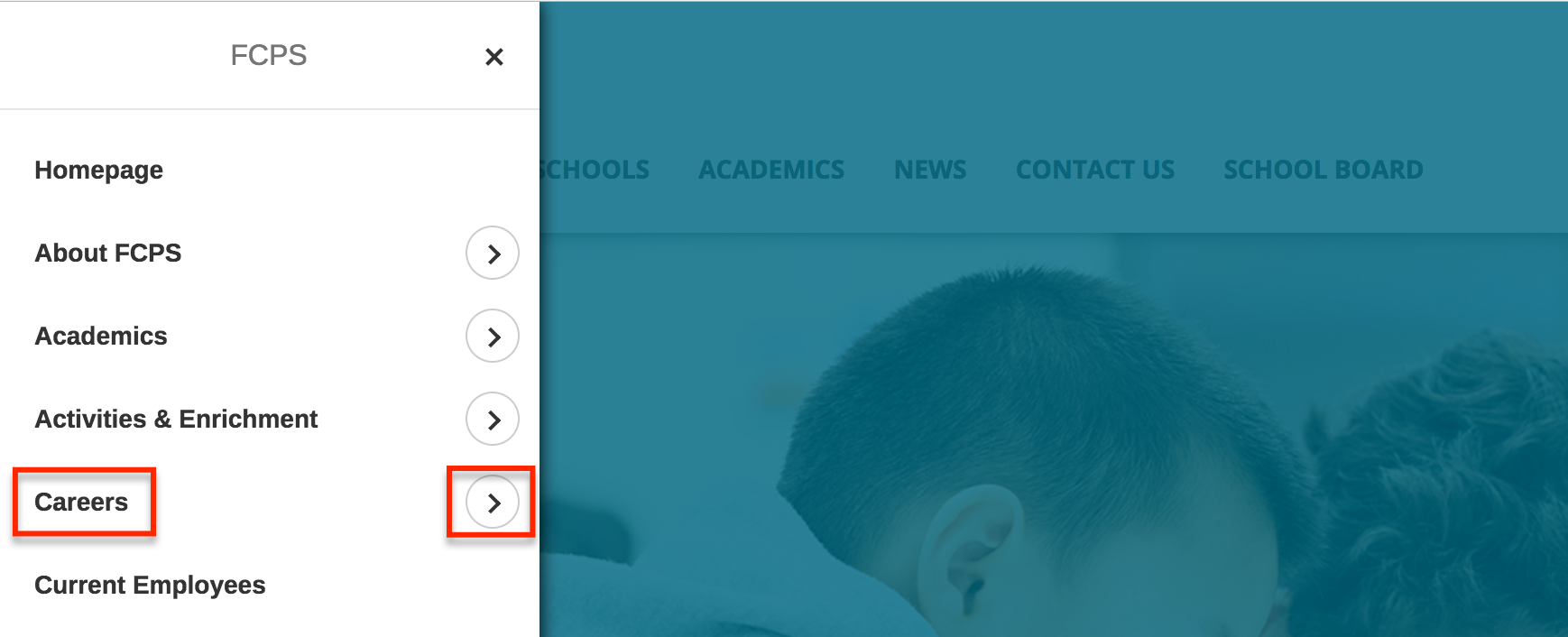 さらに、プライマリーナビゲーション項目にリンクがある場合は、言い回しやビジュアルデザインを通して関連アクションを明確にしましょう。たとえば、 Fairfax County Public School’s のフルメニューでは、ユーザーは”Careers”の文字をクリックしてCareersのランディングページにアクセスするか、矢印をクリックしてサブページを閲覧します。