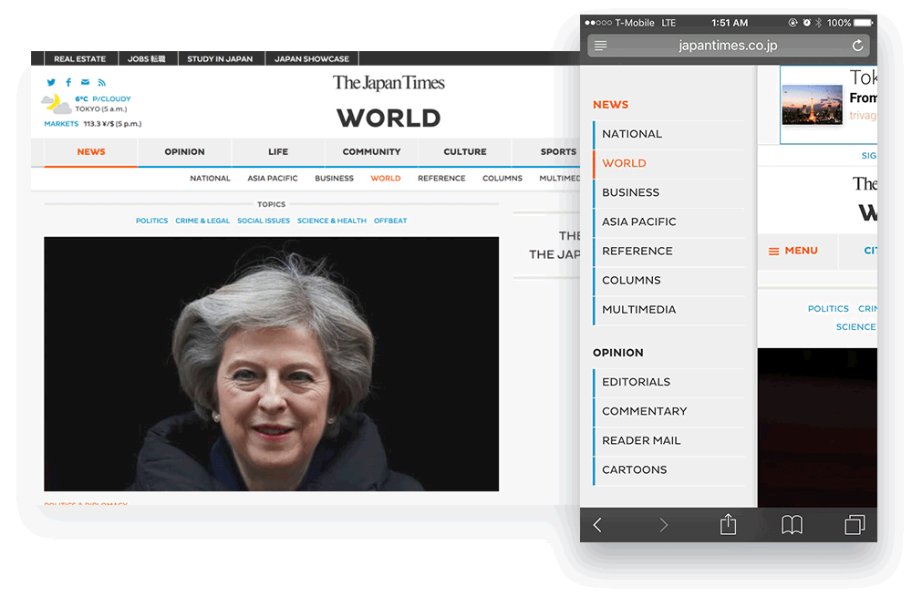 たとえばThe Japan Timesは、デスクトップではナビゲーションデザインに幅広い画面の横幅を利用して、別々のバー上にカテゴリー(セカンダリアイテム)を水平に列挙しています。モバイルでは、同じナビゲーションにハンバーガーメニューのデザインパターンを使用しています。メニューを拡大すると、モバイルの縦長のスペースを利用して各セクションのタイトルの下にセカンダリ項目がリストアップされます。プライマリとセカンダリの階層を2つのバーにわたって分けるのではありません。このデザインは直接的な変換ではありませんが、青い線をプライマリ項目ではなくセカンダリ項目の隣にあることに注目してください。これはモバイル上では実際に近いデザイン表現なのです。それぞれのビューを最適化しつつも、2つのデザイン間でのまとまりがあります。