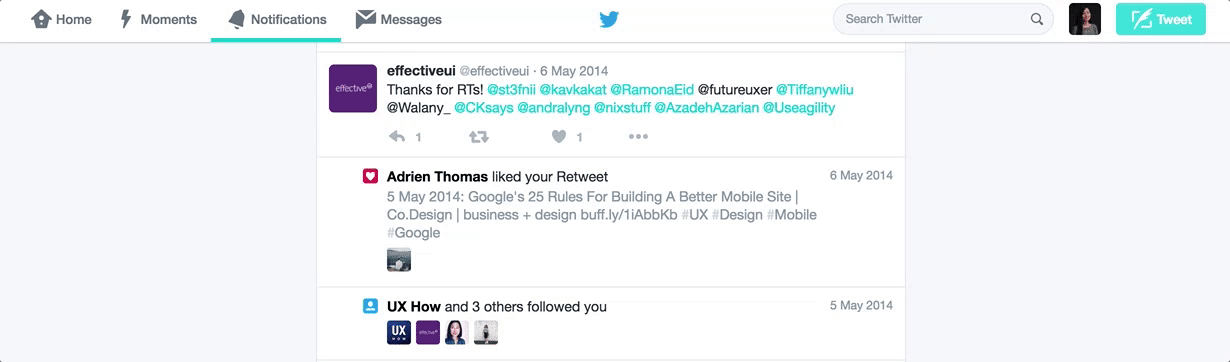 NNGの研究によると、 「ビジュアルインジケータの色とアイコンの両方が変化する場合、テキストだけのときと比べて約37%のユーザーがWebページ上のリスト内にある項目をより早く見つけることができる」そうです。アイコンの色を変化させることは、アイコンデザイン自体に加えて、アイコンの持つ別の目的を果たすことをより容易で迅速にするのに役立ちます。たとえば、Twitterでユーザーのインタラクションが不可能なアイコンは、「いいねされた」や「フォローされた」アイコンのように塗りつぶされた四角い形白い文字となっています。ユーザーのインタラクションが可能なアイコンは灰色で、マウスをかざすと色が変わりインタラクションを説明する便利なラベルが表示されます。