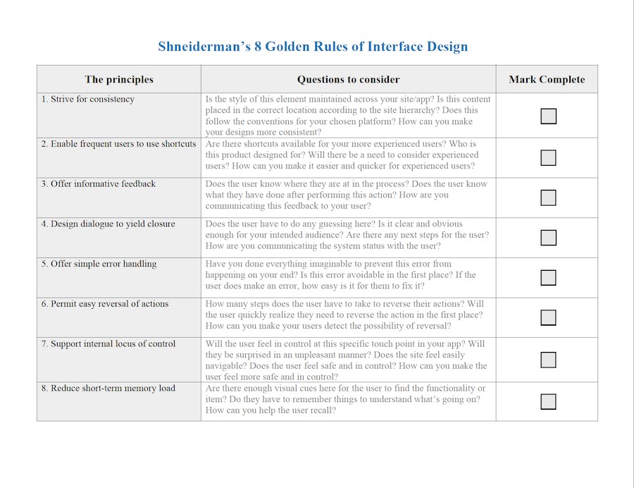 デザイナーの仕事は、直感的でストレスのないUIを作成することで、ユーザーの生活をより便利にすることです。 Shneiderman氏のインターフェイスデザインの8つの黄金律は、この仕事にとても役立つでしょう。以下に、これらのルールを適用する際に役立つワークシートを掲載しました。