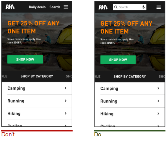 - 検索ボックスを表示しつつもスペースを節約したい場合は、検索ボックスをクリックすることでボックスが伸びるように設定しましょう。こうすることでスペースを確保しつつ、ユーザーは検索機能をすぐに見つけることができます。