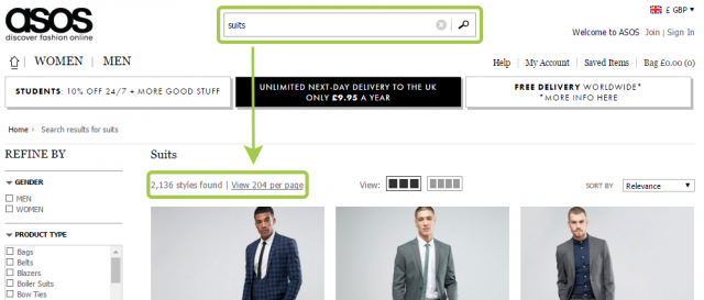 グリッドビューは、アパレルなどの製品に関する情報量が少なくても良い場合に使用できます。テキストの詳細よりも、製品の外見によってユーザーの意思決定がされるからです。つまり、ユーザーはアイテムの外見的な違いに注目するのです。よって、リストビューと製品ページを行き来するよりも、1つの長いページをスクロールすることを好みます。