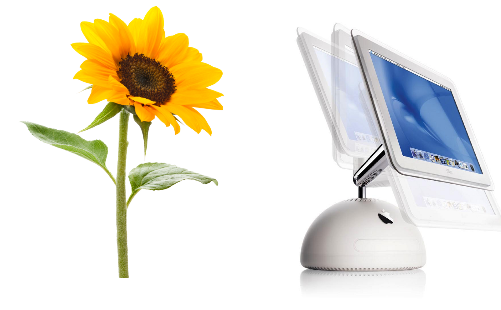 メタファーを使うことで、人々の感情を引き出すことができるでしょう。Appleが第2世代のiMacをデザインしたとき、Steve Jobs氏とJohny Ive氏は次の世代をどのような見た目にしようか、庭を歩きながら想像していたと言われています。Jobs氏はひまわりを見つけて、第2世代はひまわりのようにしたいと提案したそうです。以下の画像を見ると、画面の傾き方がひまわりのように見えることがわかるでしょう。