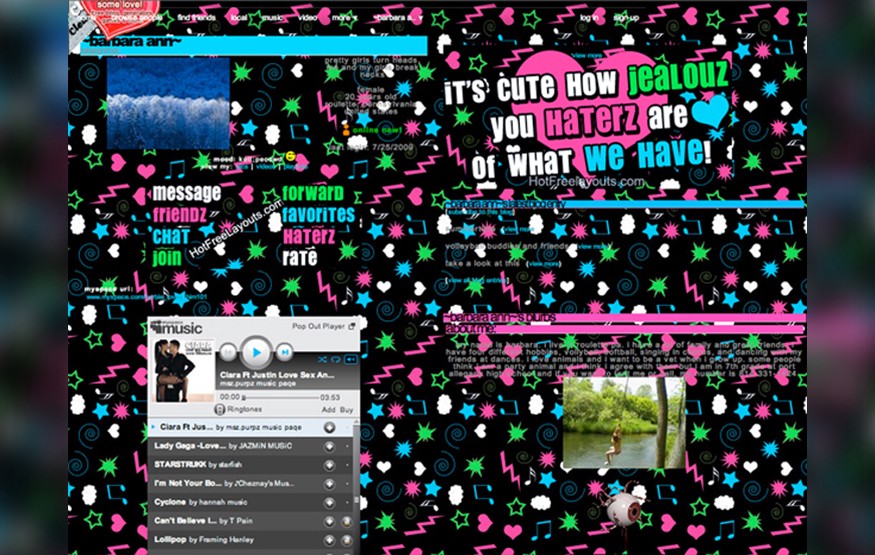 Facebookが誕生する前に存在した、コミュニケーションの方法やメディアのあり方を変えるようなソーシャルメディアと言えば、MySpaceがありました。MySpaceはFacebookと同じような客層をターゲットにしていて、Facebookよりずっと前に誕生しています。しかしMySpaceには、多くのユーザーにとってプロフィールページが見にくいという大きな問題がありました。また、MySpaceではユーザーがプロフィール画面をカスタマイズできるのですが、最終的に以下の画像のような結果になってしまいました。