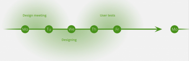 デザインスプリントも開発者のスプリントに合わせて2、3週間で行うべきだと考える方もいるでしょう。しかし、それは良いアイディアだと思いません。通常デザインは開発よりも早く行われますが、反復作業が必要とされます。デザインスプリントは、反復作業にかかるのと同じくらいの時間がかかり、外的状況に依存するべきではありません。「Agile Design Process Guide」の記事で書いたとおり、デザイナーと開発者は、たとえ同じチームに属していたとしても、異なる期間のスプリントを行って良いのです。ただ、その作業を同期させる必要があるだけです。そのため、開発者には前回のスプリントを完了させ、次のスプリントを計画するというような開発者の順番のスプリントがあり、デザイナーにもデザイナーのスプリントがあるのです。