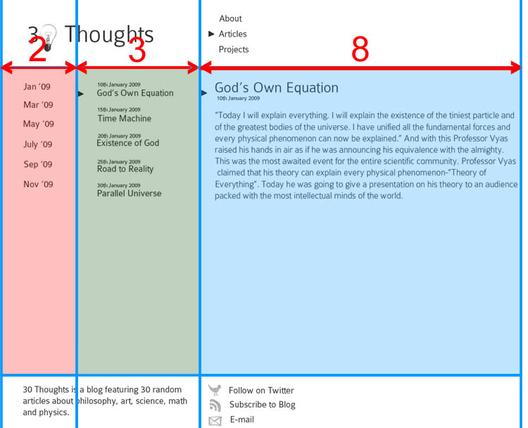 たとえば、3つの列の幅は、それぞれフィボナッチ数(2,3,8)でデザインされています。 左にある2列の幅の比は2:3で、右にある2列の幅の比は3:8です。