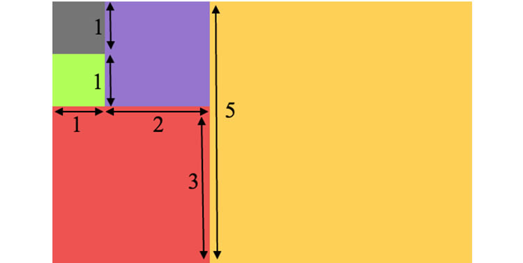 デザインでフィボナッチ数列を考えるもう1つの方法は、魅力的なレイアウトのサイトを作成するために、フィボナッチ数を「建築ブロック」として使うことです。 下の長方形は、フィボナッチ数(1,1,2,3,5)の小さい正方形から構成されたものです。