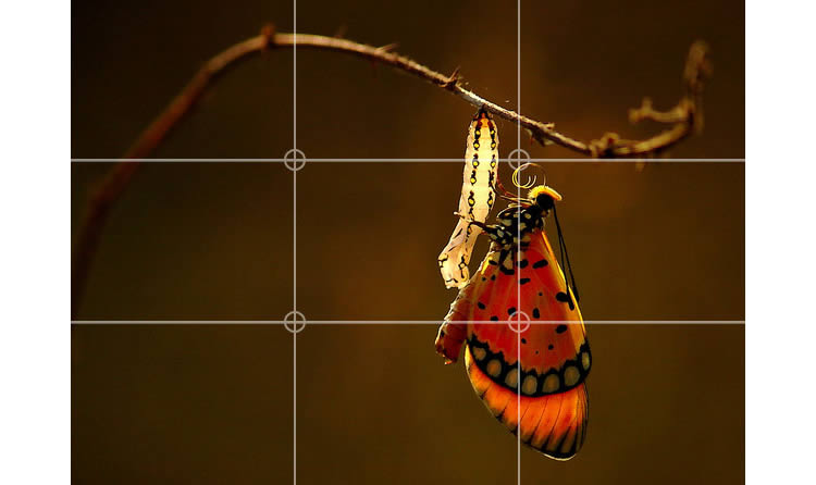 3分の1の法則では、等間隔な2本の垂直線と水平線で、9つの等しい領域に構成を分割します。3分の1の法則を使うと、コンポジションに重ね合わせて基本のグリッドを形成して、レイアウトで重要な部分を強調することができます。