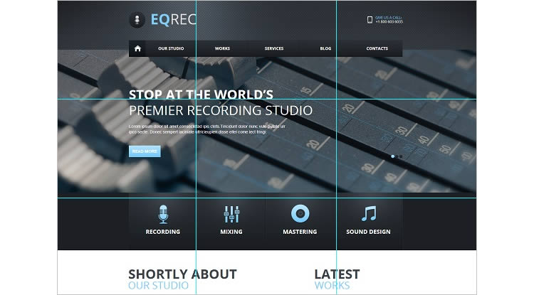 上図のEQRecのホームページを見てください。左上の交点には、このホームページでもっとも重要な、世界最高のレコーディングスタジオを訪れるためのCTA(コールトゥアクション)が配置されています。ページの残りの部分は、特にページの上部と下部のナビゲーションバーなど、綺麗に3分の1の法則に従っています。