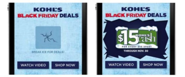 UXによって認知される広告は、直感的に認知されるものではありませんが、しっかりユーザーに気付かれるものです。ユーザーと強く関連するデータを基に働きます。つまり、閲覧履歴や習慣、ルーティーンなどに基づいてパーソナライズされたコンテンツを提供します。モバイルのプラットフォームでは、広告にインタラクション要素を組み込んで活用しているような企業もあります。Kohl’sの広告はこの例です。