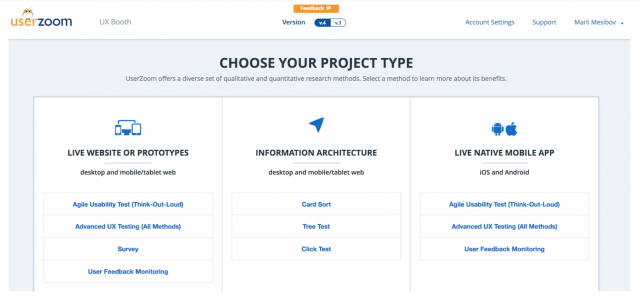 - テストのタイプを選択します。私たちの場合はアジャイル型ユーザビリティテストでした。