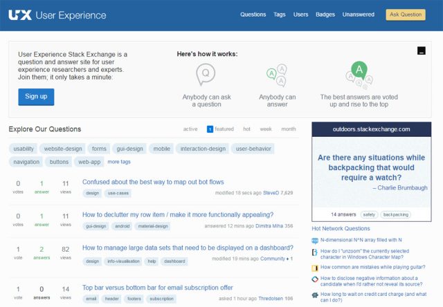 UXを専門にする優秀なサイトは数多くあります。特に以下のものは、私が質問を聞くのにお気に入りのサイトです。しかも、全部無料です。