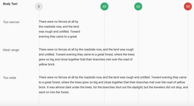 行を適切な長さにすることは、テキストの読みやすさにとって重要です。行の長さはデザインではなく、読みやすさに基づいて決めるべきです。Baymard Instituteは、読みやすさと行の長さに関して次のようにアドバイスしています。