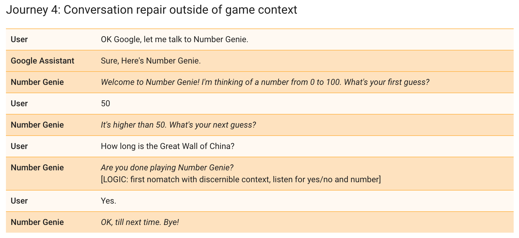- 会話が計画通りに進み、ユーザーも理想的な方法でタスクを達成するという、「幸せな」経路(Googleの例)から始めてください。