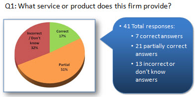 私は通常、質問に応じて結果を、不正解、正解、部分的に正解の3つのカテゴリーに分けます。もっとも注目を集めたものを聞く質問に関して、私はページの目的を伝えるとき重要な要素をリストにしています。会社のロゴ、見出しまたは説明コピー、印象強い画像などです。興味深いことに、印象強い画像にはもっとも注目が集まりがちなのですが、残念なことにそれはまた、どんな商品やサービスであるかを伝えられていないということでもあります。どんな場合でも、私はグループ毎の回答結果を集計し、そのデータを表を交えてレポートの中で提供しています。